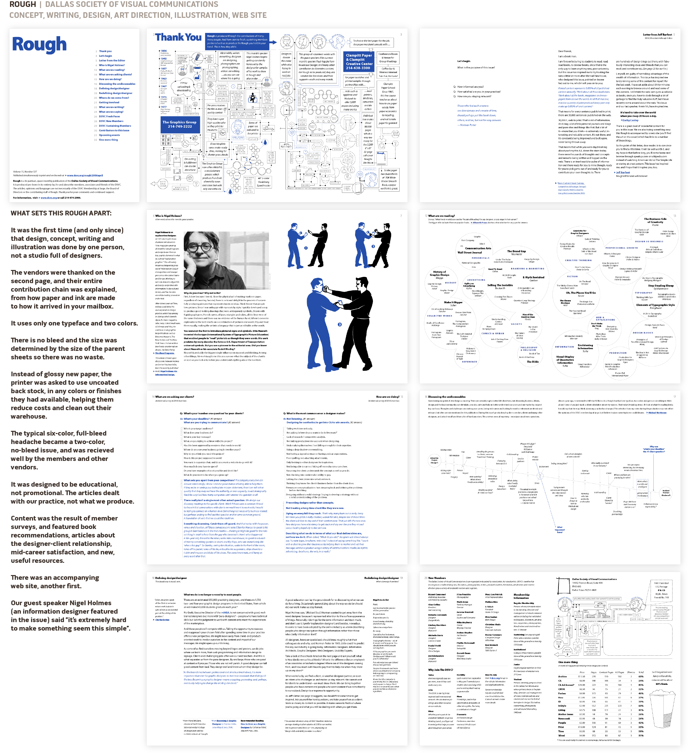 When organizations like the Dallas Society of Visual Communications produce monthly materials, it’s often to the dismay of vendors who are asked to contribute time and services, with designers demanding the hottest paper stock, the most complex techniques, and bleeds, bumps and bindings. I produced this (and the accompanying web site) to thank the vendors, and to create 32 pages of educational—not promotional—content.